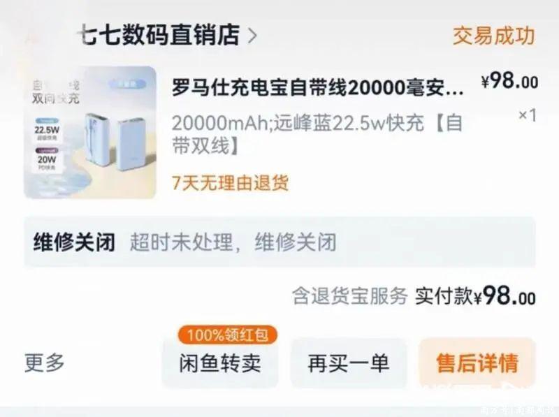 根据该消费者发布的内容,他在电商平台一家名为“七七数码直销店”的店铺内购买了一台2万毫安的罗马仕充电宝,实付款98元。6月18日晚,南都湾财社记者在电商平台查询该店铺发现,该店铺已经没有上架任何商品,记者向店铺客服发送信息,客服也已读不回。