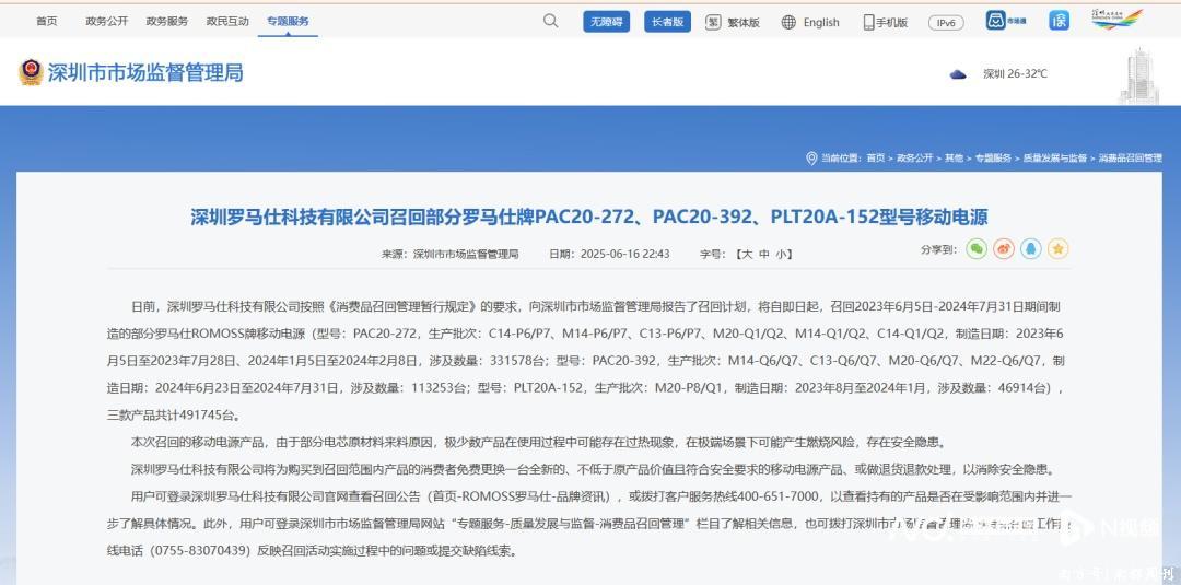 据深圳市市场监管局6月16日发布的公告,日前,罗马仕按照相关要求召回2023年6月5日-2024年7月31日期间制造的部分移动电源,召回三款型号共计超49万台充电宝。罗马仕方面表示,本次召回的移动电源产品,由于部分电芯原材料来料原因,极少数产品在使用过程中可能存在过热现象,在极端场景下可能产生燃烧风险,存在安全隐患。
